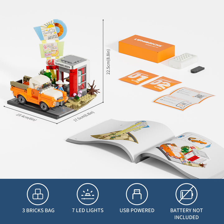 This set recreates a slice of highway life: a classic pickup truck, illuminated roadside signs, a phone booth, highway telephone line poles, and natural roadside terrain. The aesthetic evokes travel, dusk light and spontaneous stops.