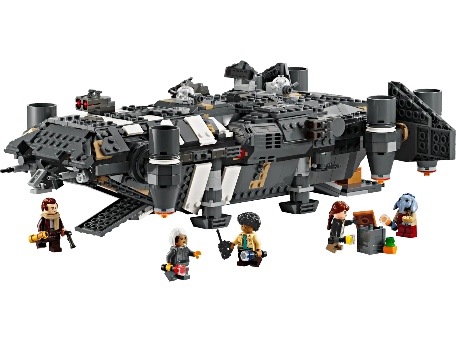 Kids become the heroes in their own Star Wars: Skeleton Crew stories with a detailed LEGO® brick recreation of The Onyx Cinder (75374). This collectible LEGO Star Wars™ buildable starship toy features rotating engines for landing/takeoff or flight, 2 stud shooters, 2 rotating turrets, each with 2 stud shooters, and a grabbing claw. It has seats for all 5 included LEGO Star Wars characters (the Jod LEGO minifigure in the cockpit and Wim, Fern, KB and Neel in the passenger compartment), plus storage for the 4 buildable torches and other cargo. There is also a kitchen table and a bed, plus accessory elements including fruit and a walkie-talkie to inspire creative play.