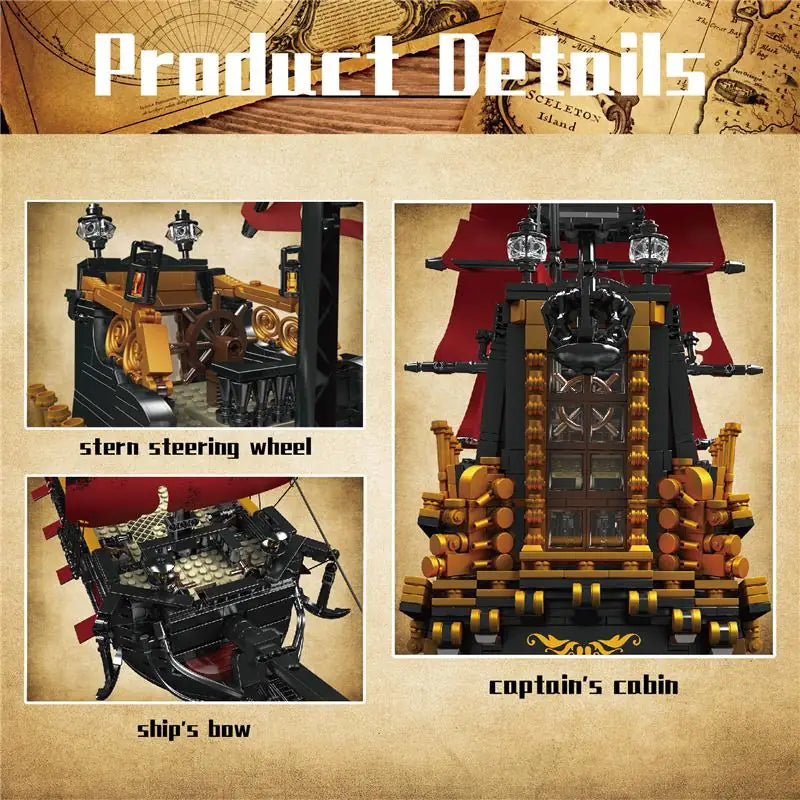 Iconic Pirate Ship Design – Faithfully modeled after the infamous Queen Anne’s Revenge, featuring a black-and-red hull, towering masts, billowing fabric sails, and intricate deck architecture.