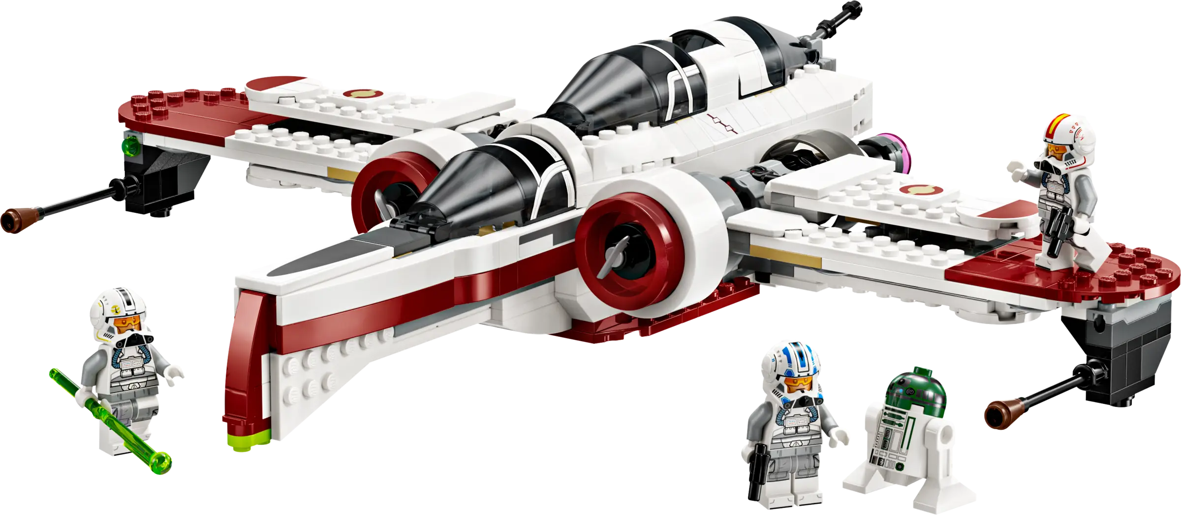 The buildable starship playset includes 4 LEGO Star Wars characters. The Clone Pilot Odd Ball, Clone Pilot Jag and Clone Pilot LEGO minifigures can be placed in the cockpits, and there is also space on board for the R4-P44 LEGO droid figure.
